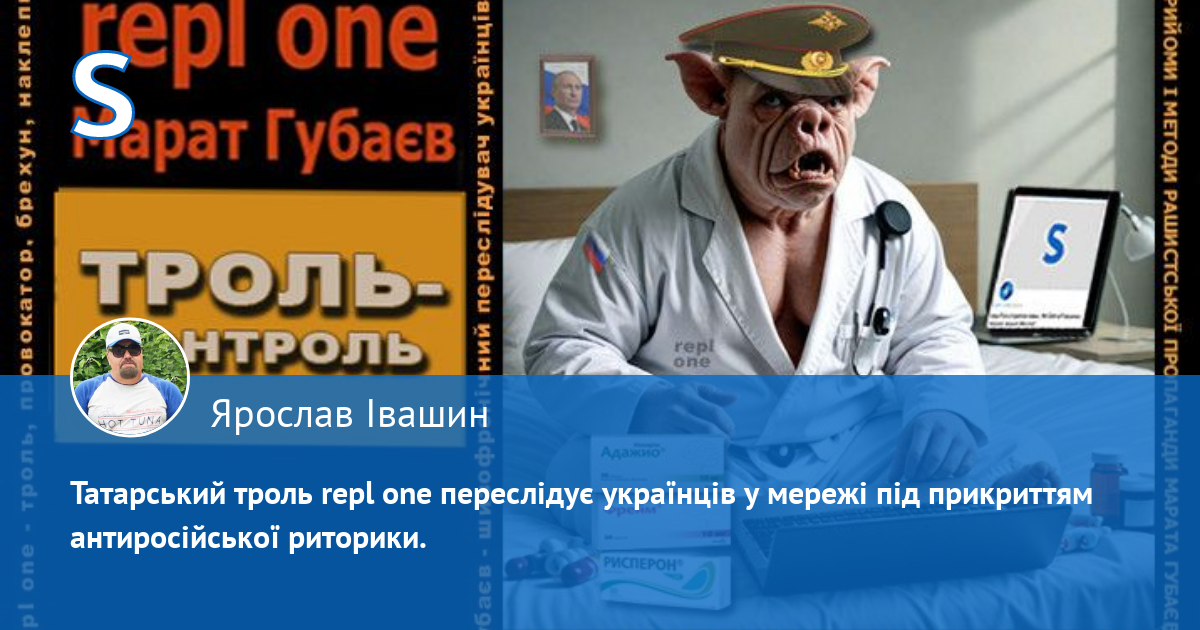 За антиросійською і пронатовською риторикою аноніма 'repl one' ховається шизофренічний кремлівський свинопес кримсько-татарського походження Марат Губаєв, який ПЕРЕСЛІДУЄ українців у мережі. Він ПЕРШИМ (!) (зверніть увагу на час публікацій) розводить і провокує срач, шляхом цинічних наклепів, у яких переплюнув рашистських пропагандистів.