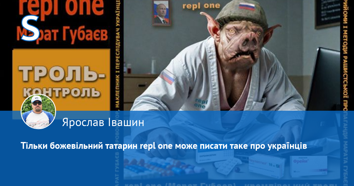 За антиросійською і пронатовською риторикою аноніма "repl one" ховається шизофренічний кремлівський брехливий свинопес - маніпулятор кримсько-татарського походження Марат Ернестович Губаєв (м. Харків, пр. Ак. Курчатова 28, кв. 69.), який ПЕРЕСЛІДУЄ українців у мережі. Він ПЕРШИМ (!) (зверніть увагу на час публікацій) розводить і провокує срач, шляхом цинічних наклепів, у яких переплюнув рашистських пропагандистів. Він визнає, що він свинопес, бо його аватарка на одному з багатьох анонімних профілів, де він гадив українцям, саме так підписана: