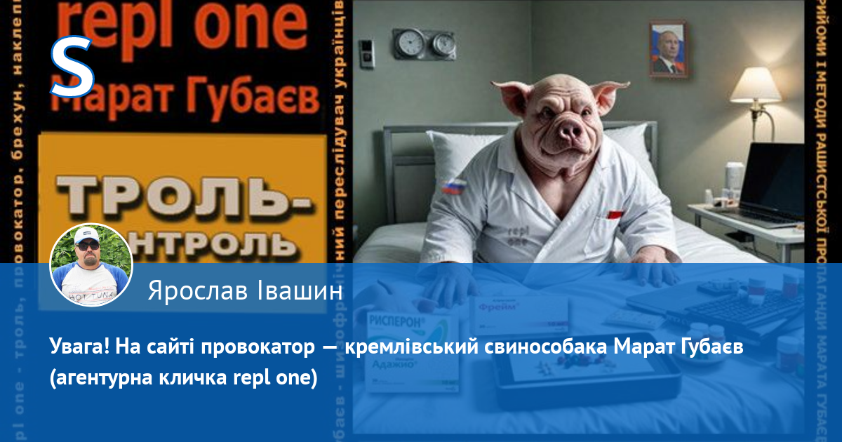 За антиросійською і пронатовською риторикою аноніма "repl one" ховається шизофренічний кремлівський свинопес кримсько-татарського походження Марат Губаєв, який ПЕРЕСЛІДУЄ українців у мережі. Він ПЕРШИМ (!) (зверніть увагу на час публікацій) розводить і провокує срач, шляхом цинічних наклепів, у яких переплюнув рашистських пропагандистів. Свинопес (свинособака) — це не образа. Він визнає, що він свинопес, бо його аватарка на одному з багатьох анонімних профілів, де він гадив українцям, саме так підписана: