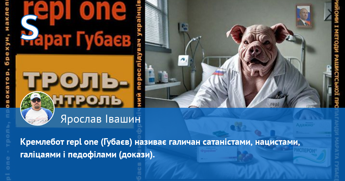 За антиросійською і пронатовською риторикою аноніма "repl one" ховається шизофренічний кремлівський брехливий свинопес - маніпулятор кримсько-татарського походження Марат Губаєв, який ПЕРЕСЛІДУЄ українців у мережі. Він ПЕРШИМ (!) (зверніть увагу на час публікацій) розводить і провокує срач, шляхом цинічних наклепів, у яких переплюнув рашистських пропагандистів. Свинопес (свинособака) — це не образа. Він визнає, що він свинопес, бо його аватарка на одному з багатьох анонімних профілів, де він гадив українцям, саме так підписана: