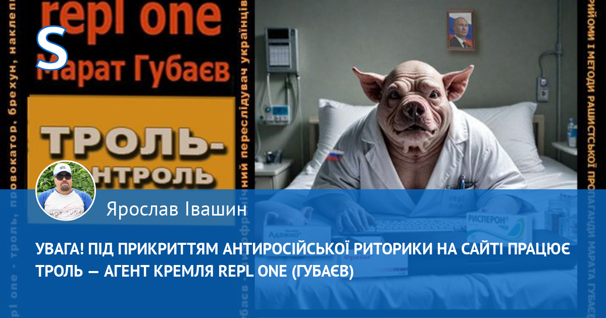За антиросійською і пронатовською риторикою аноніма "repl one" ховається шизофренічний кремлівський свинопес кримсько-татарського походження Марат Губаєв, який ПЕРЕСЛІДУЄ українців у мережі. Він ПЕРШИМ (!) (зверніть увагу на час публікацій) розводить і провокує срач, шляхом цинічних наклепів, у яких переплюнув рашистських пропагандистів. Свинопес (свинособака) — це не образа. Він визнає, що він свинопес, бо його аватарка на одному з багатьох анонімних профілів, де він гадив українцям, саме так підписана: