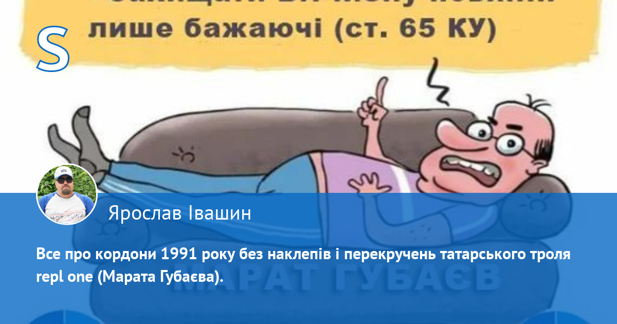Стосовно кордонів 91-го року, я постійно нагадував (моя цитата): «ПИТАННЯ КОРДОНІВ 91-ГО РОКУ РОКУ ЯК У КЕРІВНИЦТВІ УКРАЇНИ ТАК І У НАШИХ ЗАХІДНИХ ПАРТНЕРІВ МІНЯЛОСЯ, В ЗАЛЕЖНОСТІ ВІД СИТУАЦІЇ НА ФРОНТІ, І ЗАРАЗ ЦЕ ПИТАННЯ НА ПОРЯДКУ ДЕННОМУ НЕ СТОЇТЬ, ПРО ЩО Я НЕОДНОРАЗОВО НАГОЛОШУВАВ. ДИСКУСІЮ ПРО КОРДОНИ 91-ГО РОКУ ЗАРАЗ БЕЗПЕРЕРЕВНО І ПРОВОКАЦІЙНО ВЕДЕ ЛИШЕ ТРОЛЬ І ПЕРЕСЛІДУВАЧ УКРАЇНЦІВ — МАРАТ ГУБАЄВ.