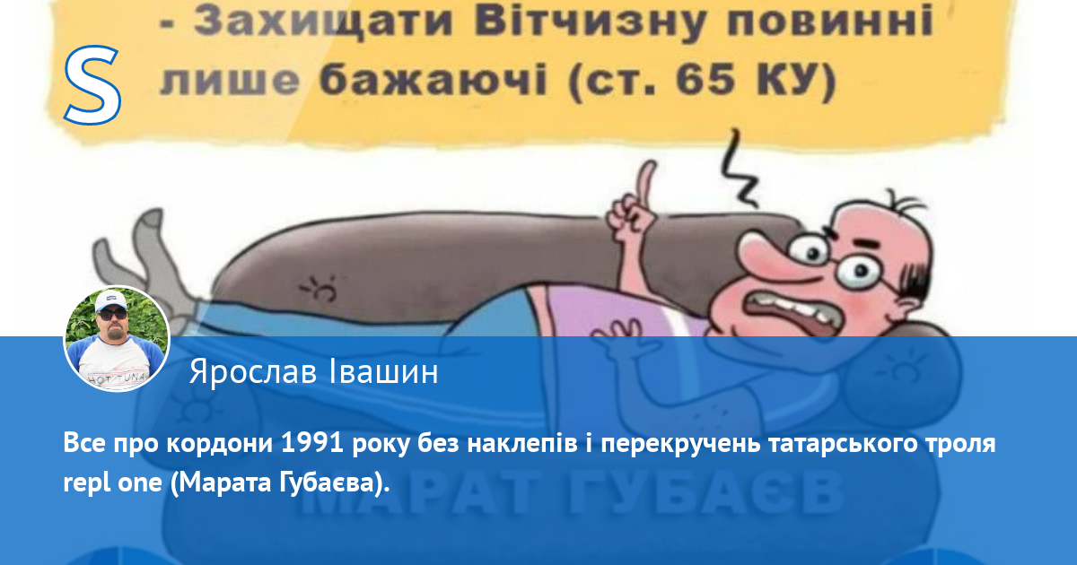 Стосовно кордонів 91-го року, я постійно нагадував (моя цитата): "ПИТАННЯ КОРДОНІВ 91-ГО РОКУ РОКУ ЯК У КЕРІВНИЦТВІ УКРАЇНИ ТАК І У НАШИХ ЗАХІДНИХ ПАРТНЕРІВ МІНЯЛОСЯ, В ЗАЛЕЖНОСТІ ВІД СИТУАЦІЇ НА ФРОНТІ, І ЗАРАЗ ЦЕ ПИТАННЯ НА ПОРЯДКУ ДЕННОМУ НЕ СТОЇТЬ, ПРО ЩО Я НЕОДНОРАЗОВО НАГОЛОШУВАВ. ДИСКУСІЮ ПРО КОРДОНИ 91-ГО РОКУ ЗАРАЗ БЕЗПЕРЕРЕВНО І ПРОВОКАЦІЙНО ВЕДЕ ЛИШЕ ТРОЛЬ І ПЕРЕСЛІДУВАЧ УКРАЇНЦІВ — МАРАТ ГУБАЄВ.