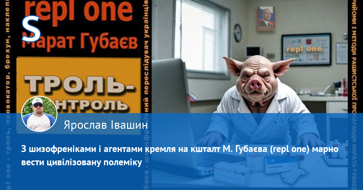 За антиросійською і пронатовською риторикою аноніма "repl one" ховається шизофренічний кремлівський брехливий свинопес -  маніпулятор кримсько-татарського походження Марат Ернестович Губаєв (м. Харків, пр. Ак. Курчатова 28, кв. 69.), який ПЕРЕСЛІДУЄ українців у мережі. Він ПЕРШИМ (!) (зверніть увагу на час публікацій) розводить і провокує срач, шляхом цинічних наклепів, у яких переплюнув рашистських пропагандистів. Він визнає, що він свинопес, бо його аватарка на одному з багатьох анонімних  профілів, де він гадив українцям, саме так підписана: