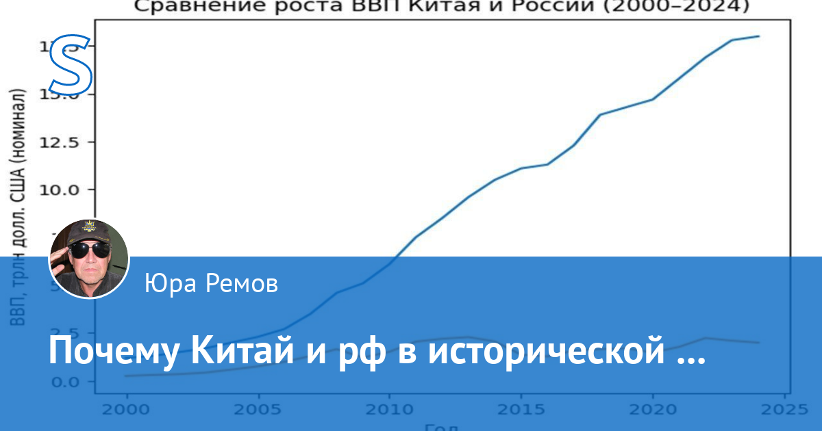 Сравним рост за последние 25 лет экономик двух огромных, но отмирающих государственных образований, Китая и РФ. Почему отмирающих? Потому что в существующем виде эти левиафаны современного мира никогда даже близко не приблизятся к западному уровню жизни населения, к которому стремятся их элиты.